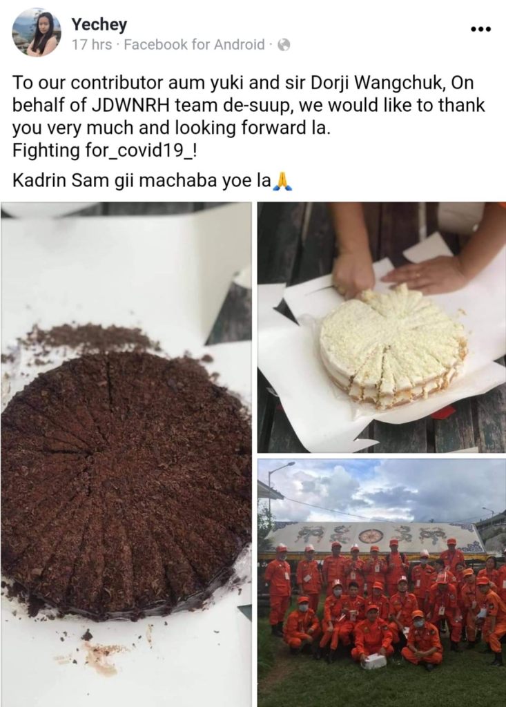My wife, who runs Café Luna, has been baking free cakes and non-stop for the front-liners since the lockdown. Since our workers are not in, our two daughters are helping. We have reached out to our Desuungs posted in Taba-Dechencholing, Hospital, HMS, RIM, MyMart, FCB store and at the Memorial Chorten. We have also served the waste collectors of Greener Way, our Heath Ministry officials and doctors, our veterinary hospital staff, our two media houses – BBS and Kuensel, the Education Ministry officials and teachers, and, of course, our Prime Minister’s Office.
