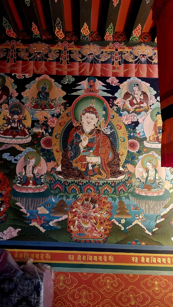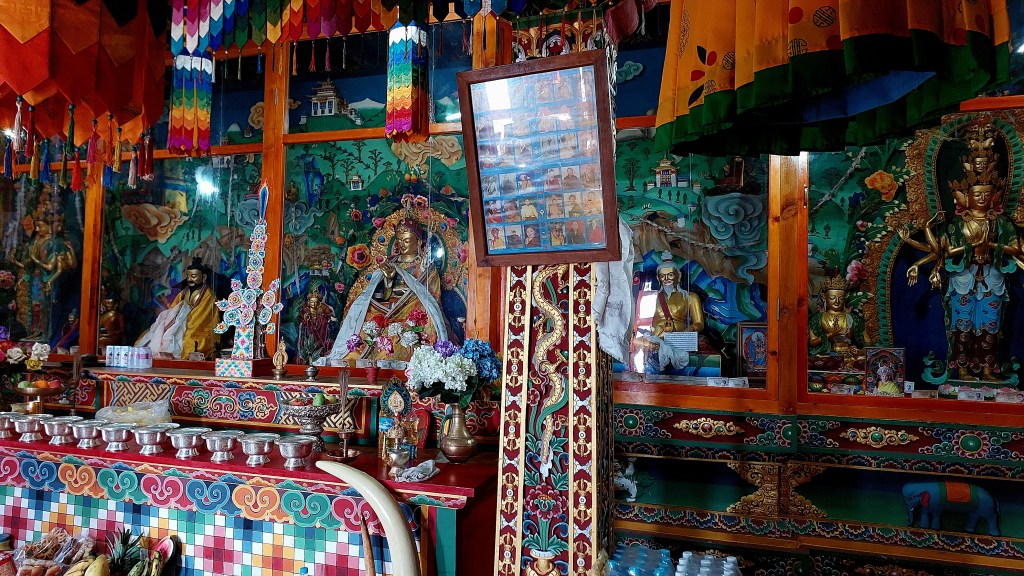 The center statue of the altar is Guru Nangsi Zillnoen (Guru Padmadambhava). He is flanked on either side by Cherizig Chha-Tong (1000-arms Avalokiteshvara). On the right side of the altar is Namsey Zambala – the Wealth Deity, and the Protector deity Mahakala.