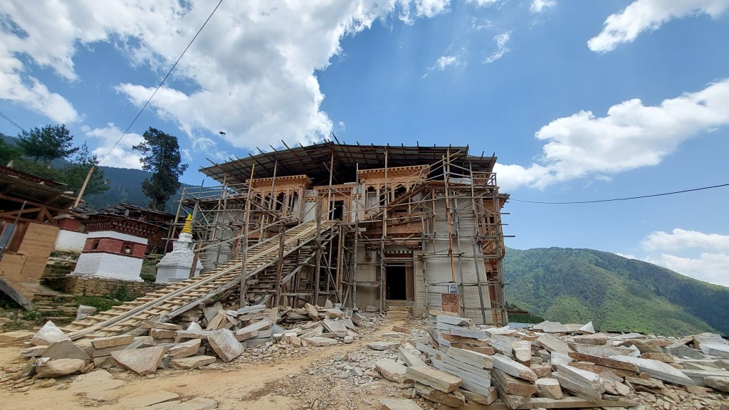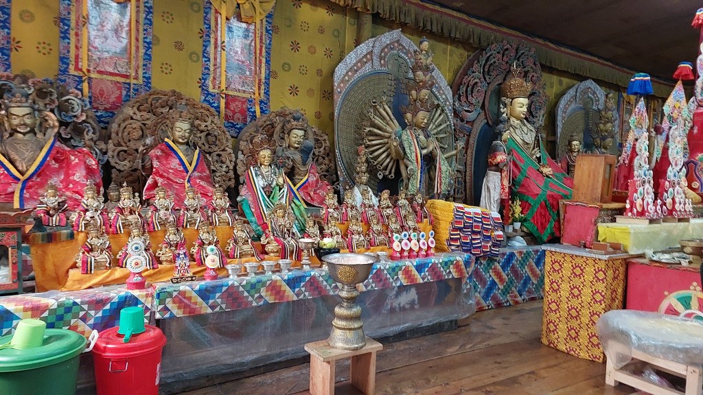 The temple is under construction and all statues are in a temporary hut, except Duesum Sangye ( Dz. དུས་གསུམ་སངས་རྒྱས; Buddhas of The Three Eras – Buddha Dipankara, Buddha Shakyamuni and Buddha Maitreya) on the ground floor. The statue of Shakyamuni is considered as sung-joen (talking statue) and hence is very sacred.