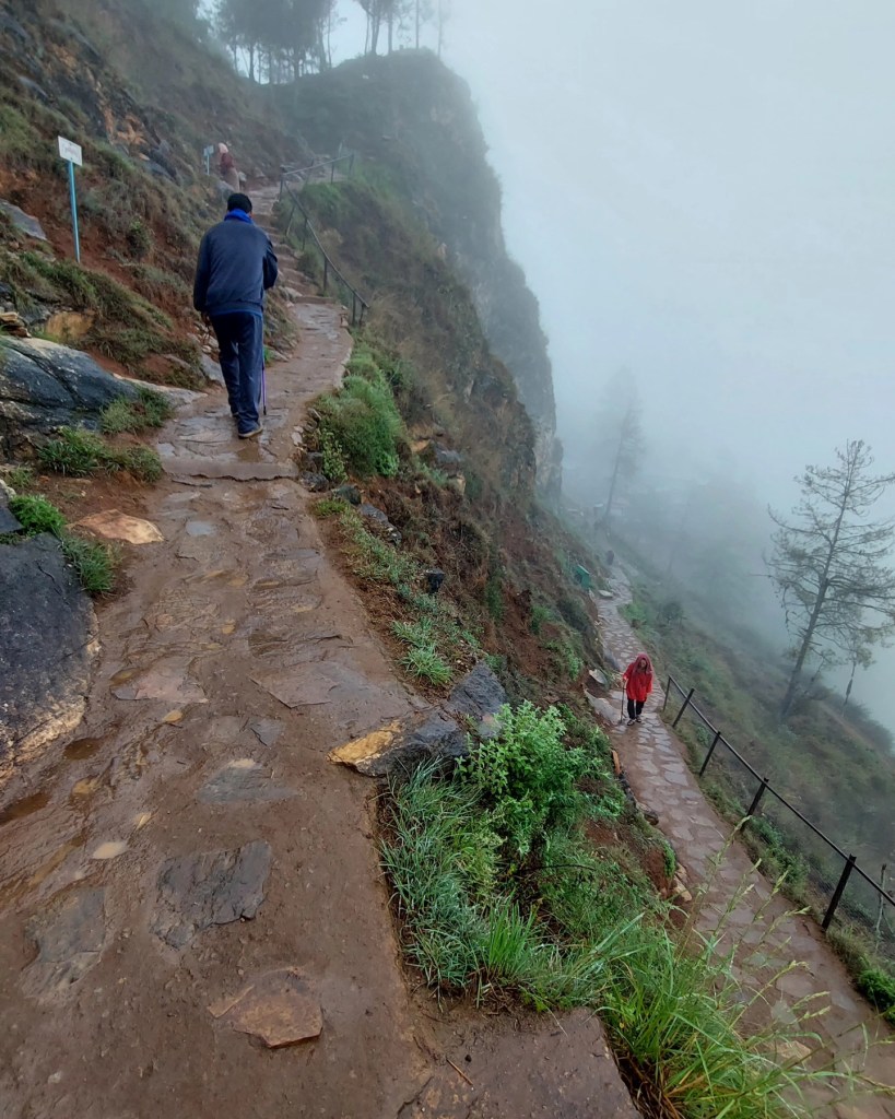 To provide some context, first, the mountain stands at almost 3,000 metres above sea level and the trail is around one kilometre long. A quick maths says 108 rounds equates to 108 kilometres. This is equivalent to two marathons back to back. Second, the trail moves vertically like a clock. You climb up from the base, reach a plateau, and then you walk down from the other side. It is not a flat walk. Both your knees and your thighs get killed in the process. When it rains, like it did on my first day, the trail is slippery – adding extra pressure on your legs.