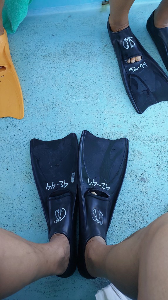 He had a few tips: hold the snorkel with the teeth, close the mouth, and breathe only through the mouth. And if I find myself tired or anxious just roll over and lie flat looking up at the sky to regain my breath. And raise your hand if you are in trouble.