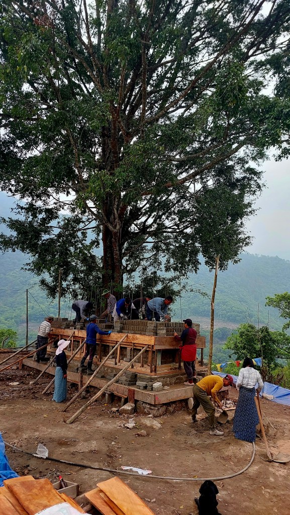 Picture 1 – Every major construction starts with a salang tendrel (Permission Seeking Ceremony) where we ask the consent of the earth deity to build the stupa. We offer 12 sacho bumter (vase of treasure) – four each for the three chortens. This offering is considered as a gift to the earth deity for allowing us to occupy the ground.Picture 2 – The first structure over the ground is the Sa-zin (foundation). This stage is important to provide the correct direction of the stupa (called Chho in Dzongkha). It should not face any direction randomly – especially its shadow should fall in the direction of any private homes. A master astrologer or a realised lama should do this to ensure that it benefits all sentient beings and hurts no one. Picture 3 – The next is to build three stairs called them-kha. Here inside the walls we have the first set of zung (relics) going in – consisting of farming implements and an old urn at the bottom layer. After covering this layer with juniper leaves the men and women garment and jewelries are spread – including arms and ammunition.Picture 4 – Then comes the Thri (throne) where the second set of Zung is buried. Here, inside of it, we offer a full set of religious musical instruments, and as many yangbum (vase of prosperity).Picture 5 – Every inch of the hollow space is filled with tsatsa (mini stupas) and dried juniper leaves. If juniper leaves are not available dry sand is fine too. The thing to remember is not to leave any space.
