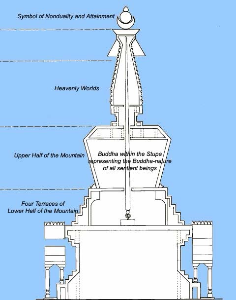 Stupas were adapted in the Buddhist world from earlier traditions as monuments for simply safekeeping the mortal remains of Buddha. Over time they evolved both in terms of physical aspects as well as the content. What is common to all types of chorten in the Buddhist world is that there are five physical structures to represent the five natural elements of earth, water, fire, wind, and space. Chortens in Buddhism are built as representation of the Buddha as seated in a lotus position.