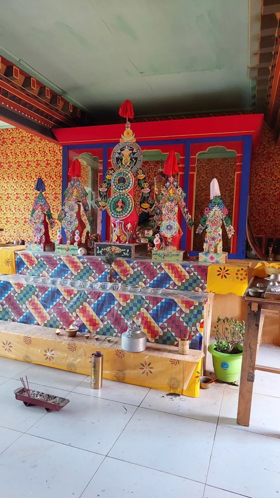 Fast forward to 2024, the third temple – a tshokhang (community hall) dedicated to Guru Padmasambhava – my birth deity, is getting the finishing touches of religious art on the ceiling – three mandalas of Tshela Namsum (Buddha Amitayus, Unisha Vijjaya and Tara). These mandalas when completed would throw down more blessings when anyone does ceremonies to Sangye Tshepamay, Namgyelma or Jetsun Drolma.